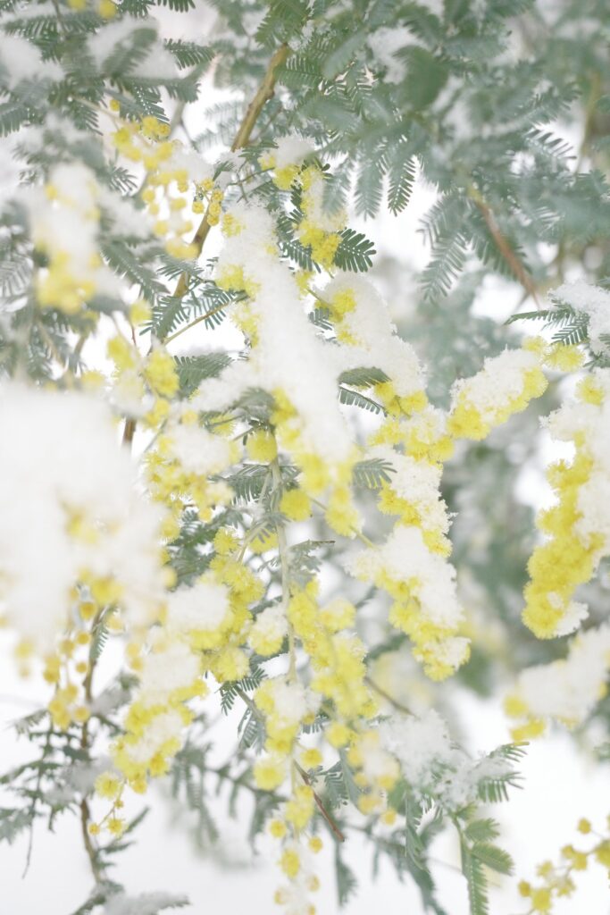 本日2月8日、雪景色の東京ですね。(写真は本日のわが家の雪化粧のミモザです)